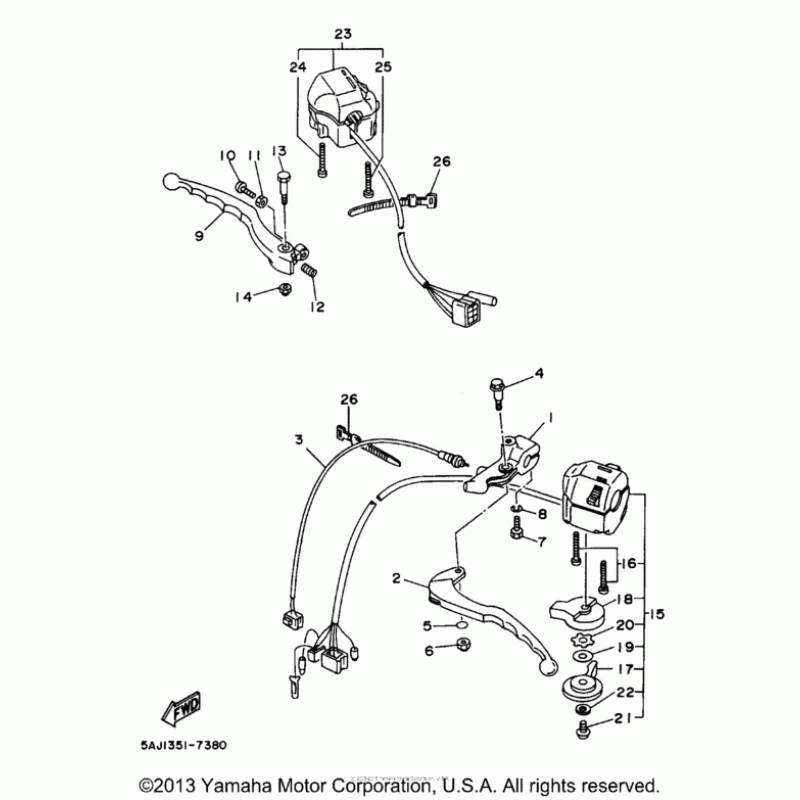 Схема узла: Пульт управления рулевой и Рычаг Yamaha XV250 Virago