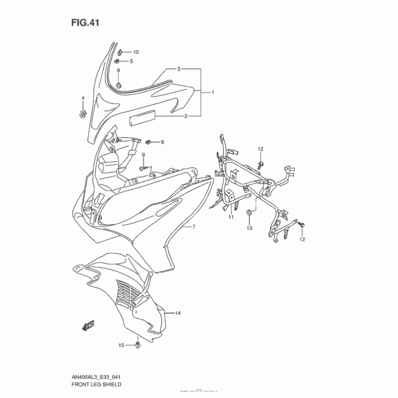 Деталізація вузла Front Leg Shield (An400Al3 E33) для Suzuki AN400 Burgman (European analogue of ""SkyWave"".