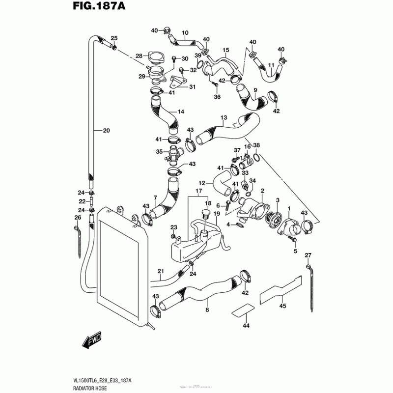 Деталізація вузла Патрубок системи охолодження (Vl1500Tl6 E28) для Suzuki VL1500 Boulevard C90T.